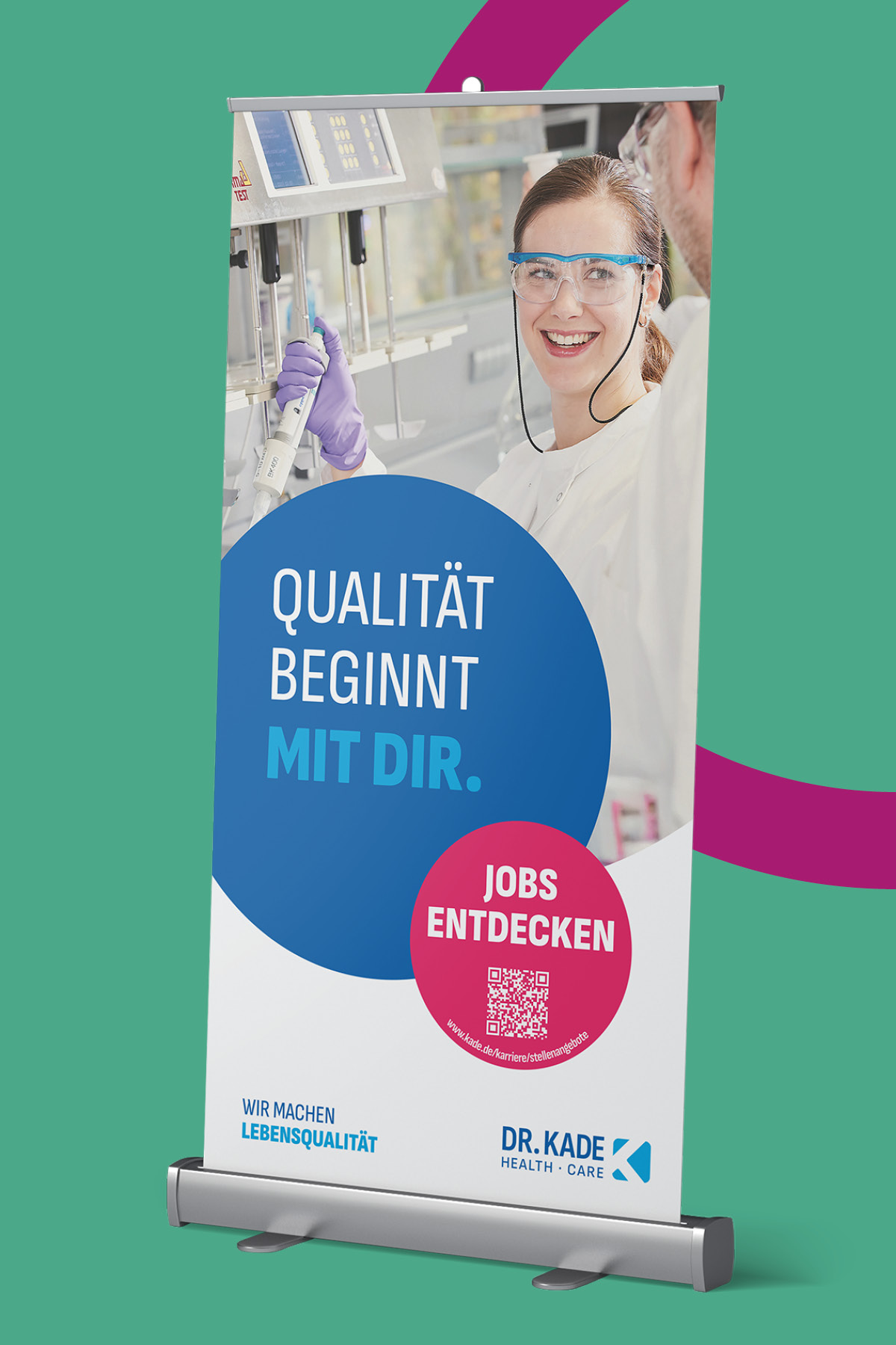 Passend zum neuen Corporate Design wird der Employer-Branding-Relaunch umfassend auf allen Kanälen ausgerollt. DR. KADE wird dabei nicht nur digital sichtbar, sondern an jedem Touchpoint menschlich erlebbar. Neben einem neuen, umfassenden Karrierebereich auf der Website gehören dazu auch vielfältige Offline-Maßnahmen wie aufmerksamkeitsstarke Roll-Ups für Messen oder Poster direkt im Unternehmensumfeld, sowie ein eigener Podcast. Die visuelle Umsetzung setzt durchweg auf reale Arbeitssituationen und echte Mitarbeitende. CI-gerechte Loop-Grafiken fügen sich dabei als Qualitätsschleifen oder Fokusrahmen dezent in die Bildwelt ein.