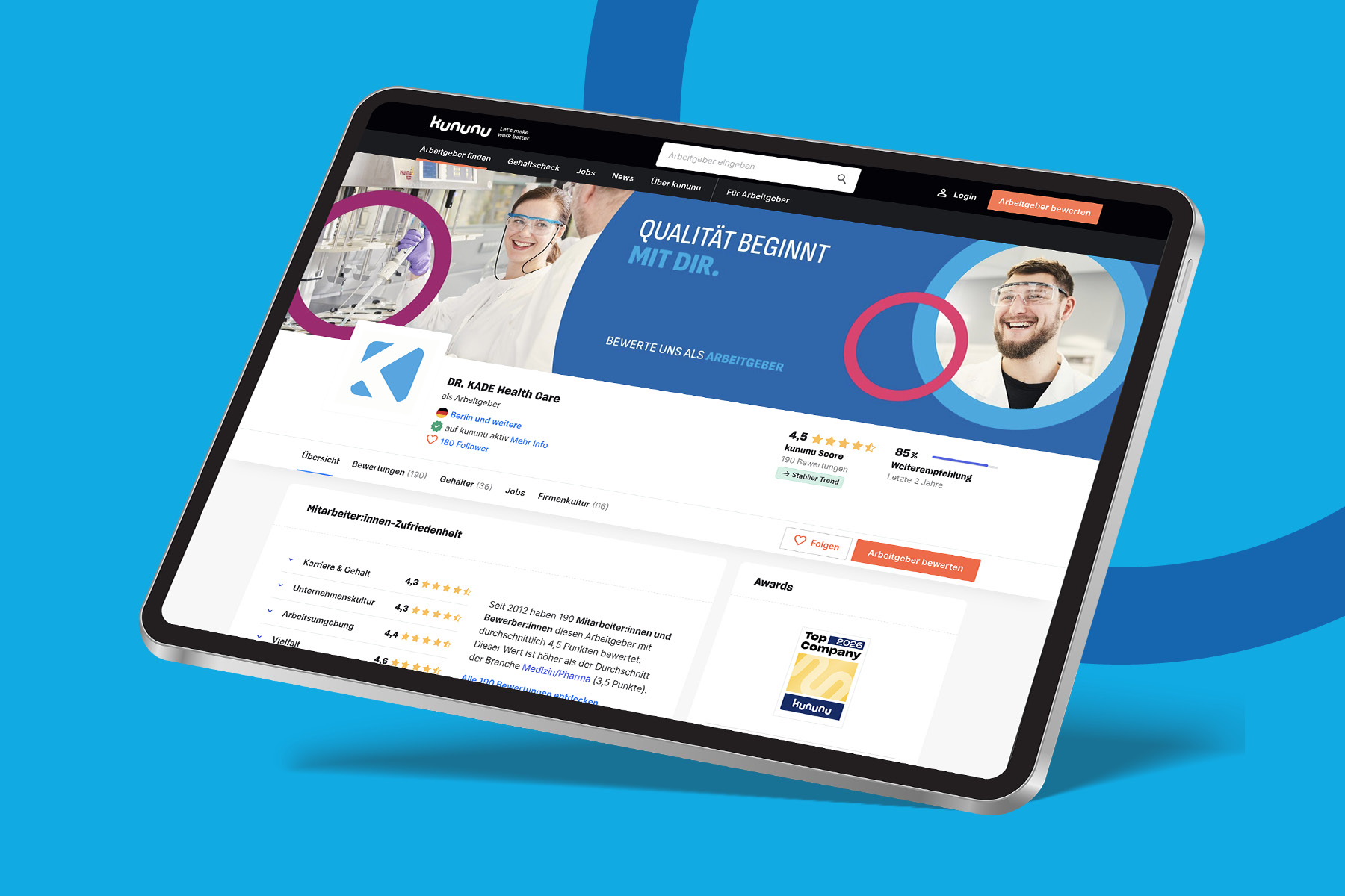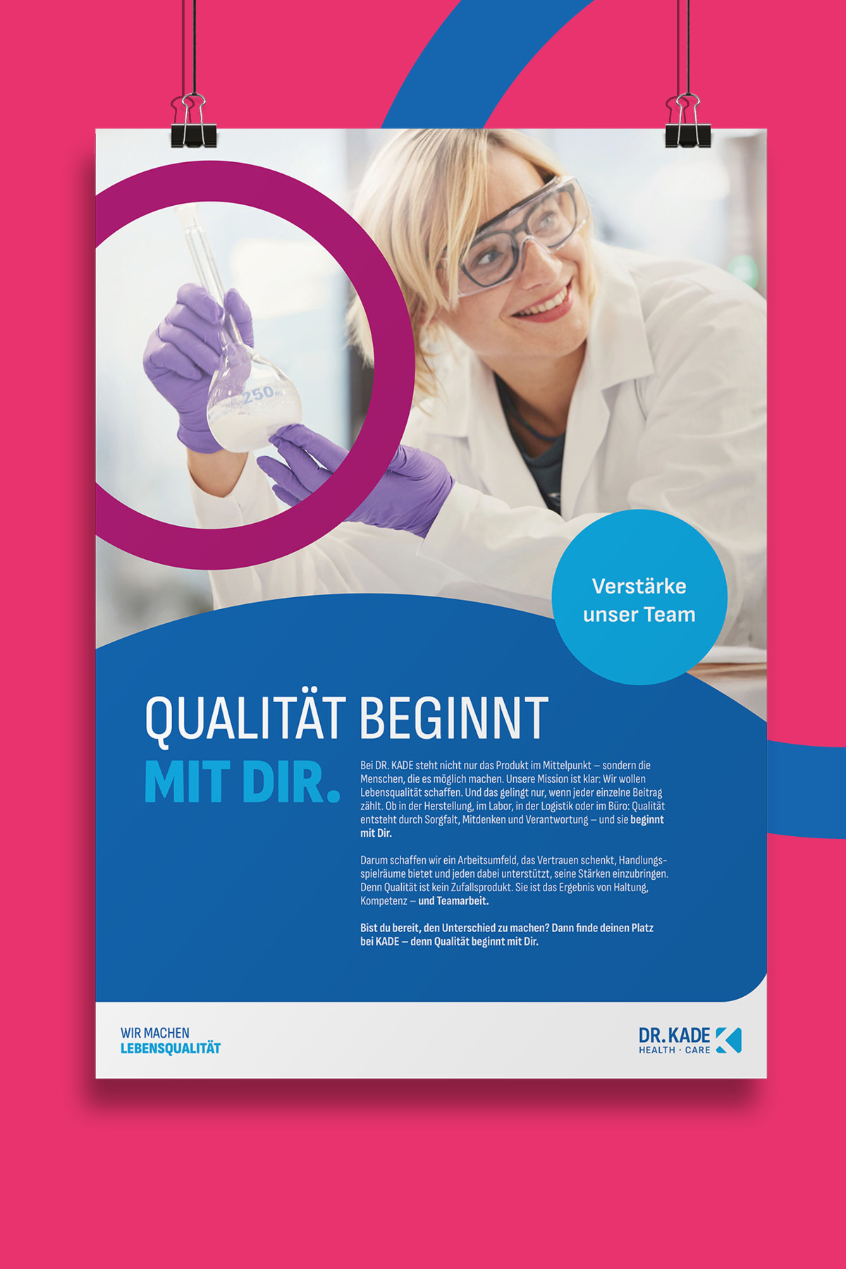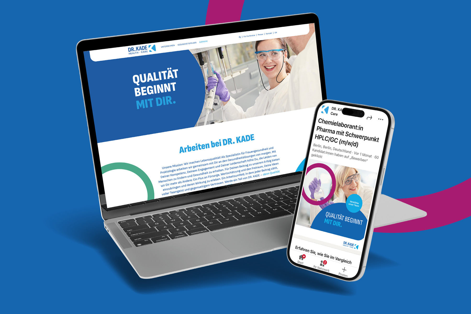 Der Wettbewerb um die besten Fachkräfte hat auch in der Pharmabranche längst begonnen. Um hier langfristig zu bestehen, sollte die Positionierung von DR. KADE als moderne Arbeitgeberin geschärft und in einen modernen, frischen Auftritt übersetzt werden. Dazu galt es, insbesondere fachliche Exzellenz und sinnstiftende Arbeit in sensiblen Gesundheitsbereichen wie der Frauengesundheit und Proktologie erlebbar zu machen. Die wertebasierte Haltung des Unternehmens sollte dabei nach innen wie außen sichtbar werden und eine starke, gemeinsame Markenidentität für alle bieten – vom Labor bis zum Vertrieb.
